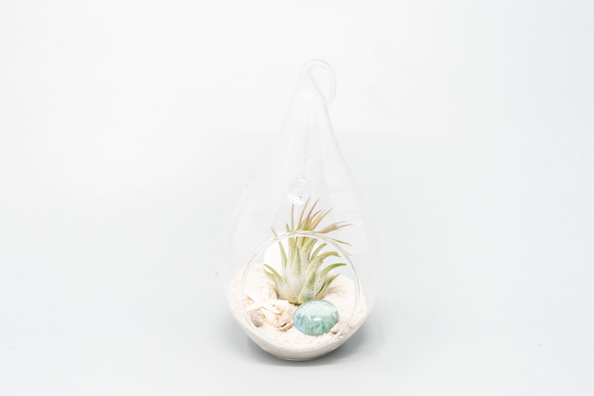 These cute beach terrariums in teardrop glass are wonderful gifts, favors, or decorations. The kits include white sand, various sea life, glass bead, and ionantha. Just pour the sand in and place the starfish, seashell, and air plant inside. It is that easy!