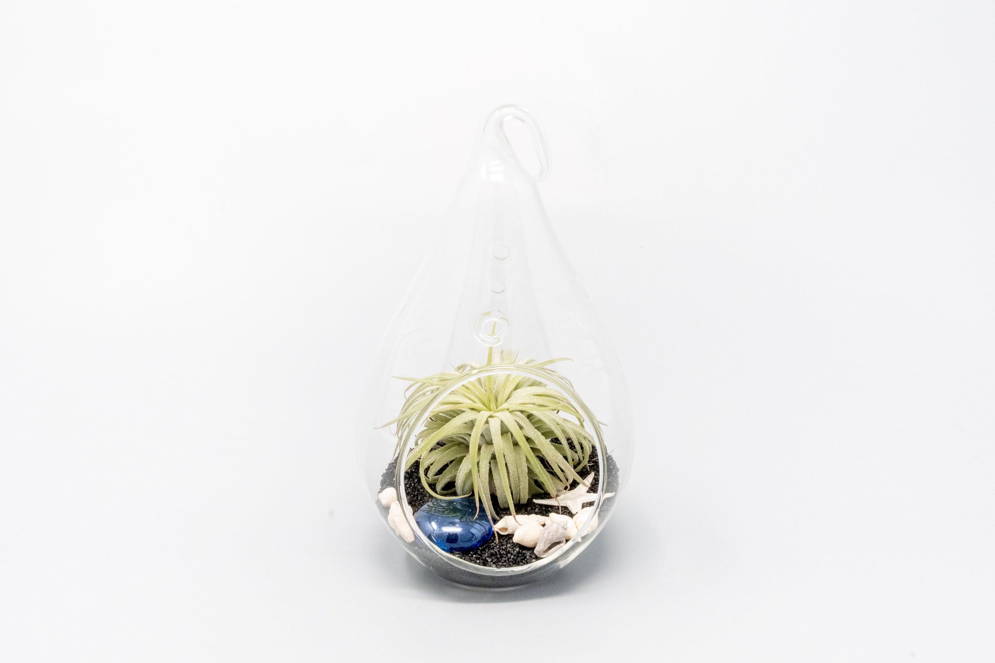 These cute beach terrariums in teardrop glass are wonderful gifts, favors, or decorations. Just pour the white sand in and place the various sea life, glass bead, and air plant inside. It is that easy! They have a hook for hanging or you can place them on their flat bottom.